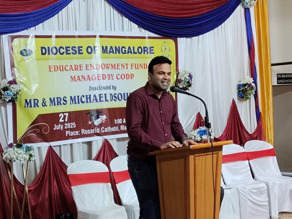 Bishop Saldanha, while citing the story of Thomas Alva Edison and his mother’s unwavering faith, reminded students to cherish the selfless support of Michael D’Souza, likening him to a parental figure in their educational journey. Earlier, Rev. Fr. Vincent D’Souza, Director of CODP, welcomed the gathering and led the prayer, hailing Michael D’Souza as a “missionary of social development” for the Diocese. In a motivational address, Mr. Michael D’Souza reflected on the changing dynamics of education: “In our time, a graduation was considered higher education. Today, higher education is common but costly, often unaffordable for middle-class families.” He revealed that CODP has processed over 9,000 loans under the Educare program. He urged students to remain grounded, saying, “Wealth comes and goes, but knowledge stays. Let neither money nor degrees cloud your humility. Always remember your parents, your mother tongue, and your motherland.” Several beneficiaries, including Melisha Priya Quadras (Kinnigoli), Shallet Rebello (Mulky), Joyce Sharal D’Souza (Pangala), Nirmala (Kadaba), Pradeep Pinto (Bejai), Sharal D’Souza (Mariashram), Nishmitha (Vittal), and Anish D’Souza (Germany), expressed their heartfelt gratitude to Michael D’Souza, his family, and CODP. Prof. Richard Alvares, a member of the Educare panel, inspired the students with his “5G Philosophy” – God, Goal, Gratefulness, Growth, and Gift – encouraging them to invest time wisely and believe in themselves. Other dignitaries present included Mrs. Flavia D’Souza, Mr. Manu, Educare advisor Prof. CA Lionel Aranha, former banker Stephen Pinto, educationist Oswald Rodrigues, and Henry D’Souza. The program was compered by Ms. Shiny D’Souza, an Educare scholar, and the vote of thanks was delivered by Rev. Fr. Lawrence Cutinha, Assistant Director of CODP. The event witnessed the participation of over 500 students and parents.